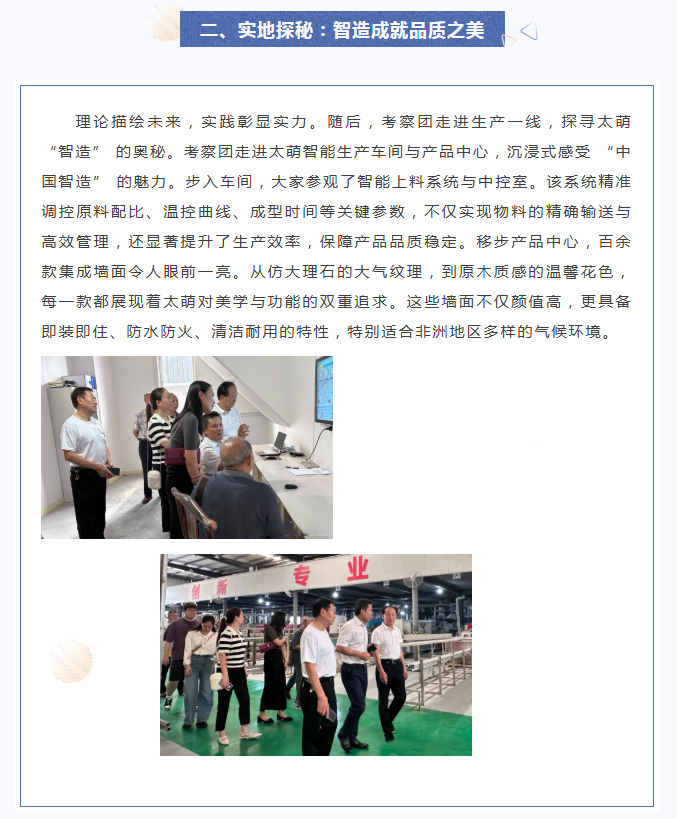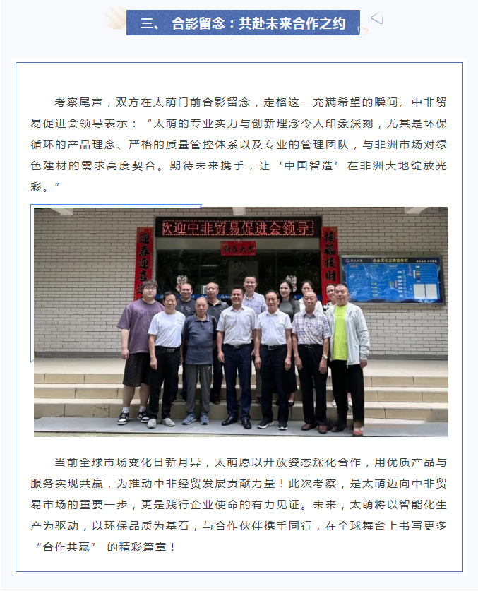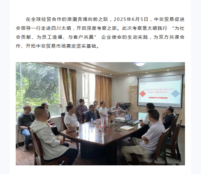 【概要描述】在全球經貿合作的浪潮奔涌向前之際,2025年6月5日,中非貿易促進會領導一行走進四川太萌,開啟深度考察之旅。此次考察是太萌踐行 “為社會貢獻、為員工造福、與客戶共贏” 企業使命的生動實踐,為雙方共謀合作、開拓中非貿易市場奠定堅實基礎。